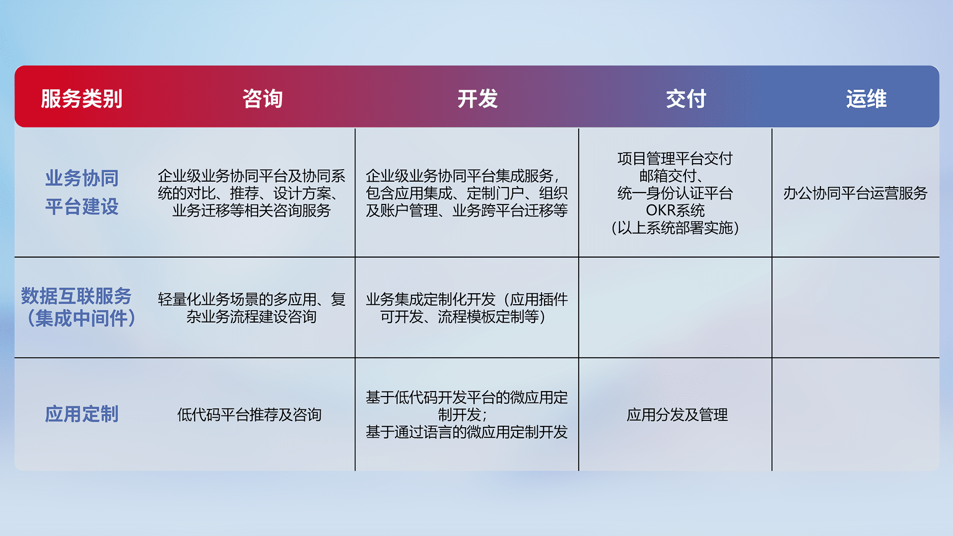 针对钉钉、、、企微、、、、IDaas等平台级产品提供产品的规划、、、方案、、交付、、、定制化开发等服务,,,实现如统一协同办公、、、、智能客户服务、、、混合会议管理、、、智能数据查询、、、等业务场景,,,,实现数字化转型。。。