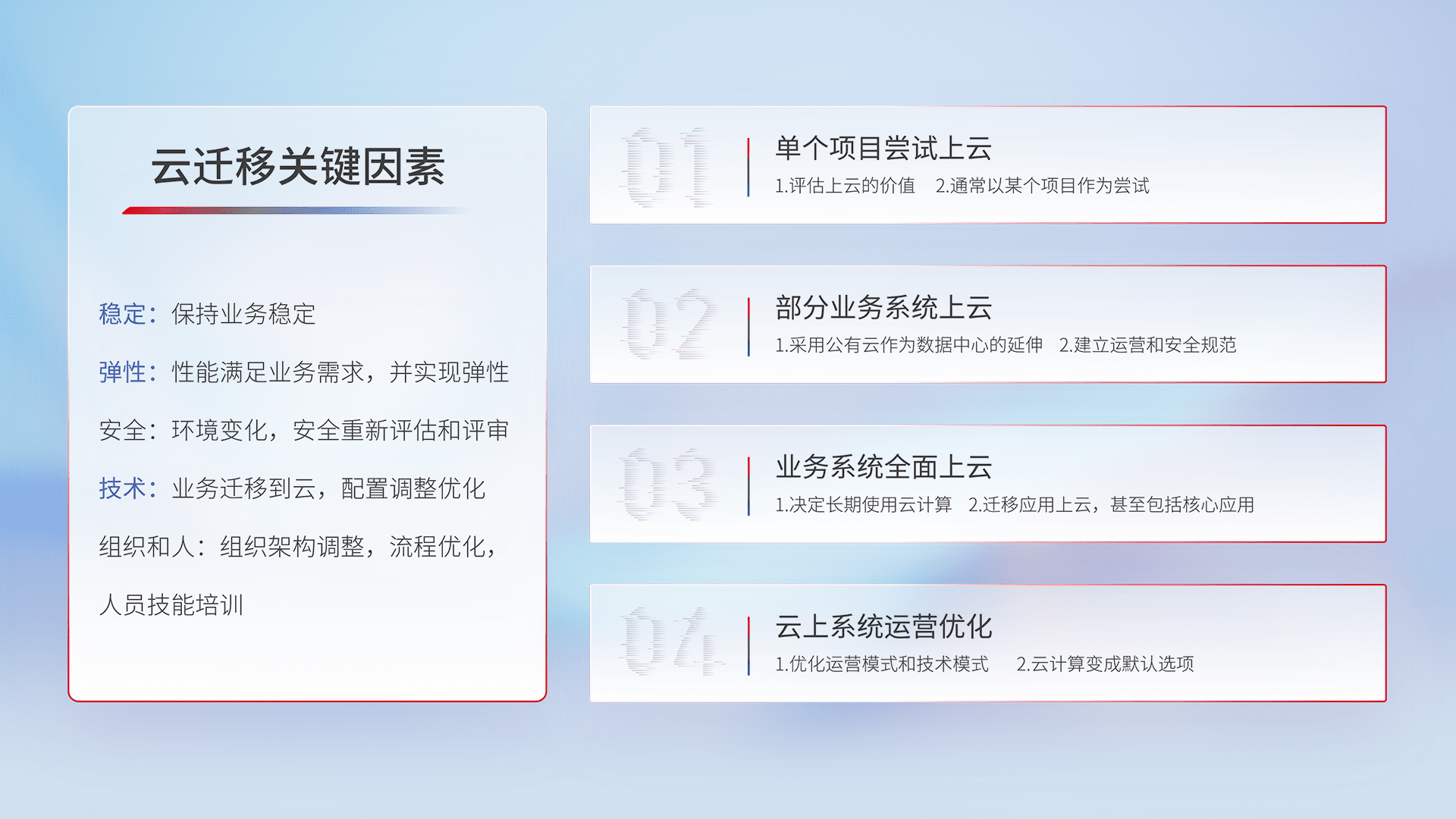 结合实际业务,,,从规划设计、、、、云平台选型、、、云原生改造、、、数据迁移、、、、集成交付,,,迁移全过程为客户识别最佳上云路径,,做好风险识别管理,,设计网络架构、、、、身份权限、、、安全审计合规、、、、操作审计、、、、日志审计、、监控告警策略、、、、多站点容灾设计等,,,对云上基础设施进行整体规划,,提升IT治理水平,,以满足弹性、、、、高可用、、高性能的需求。。。