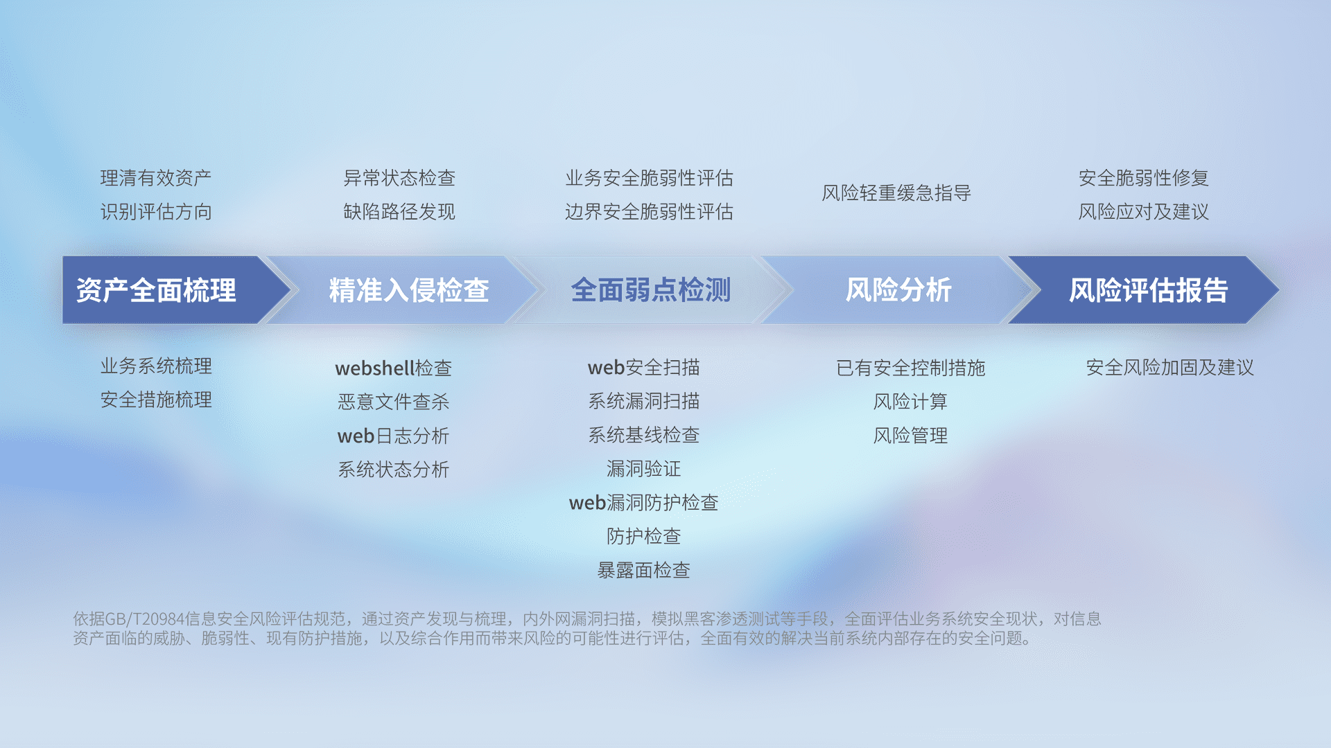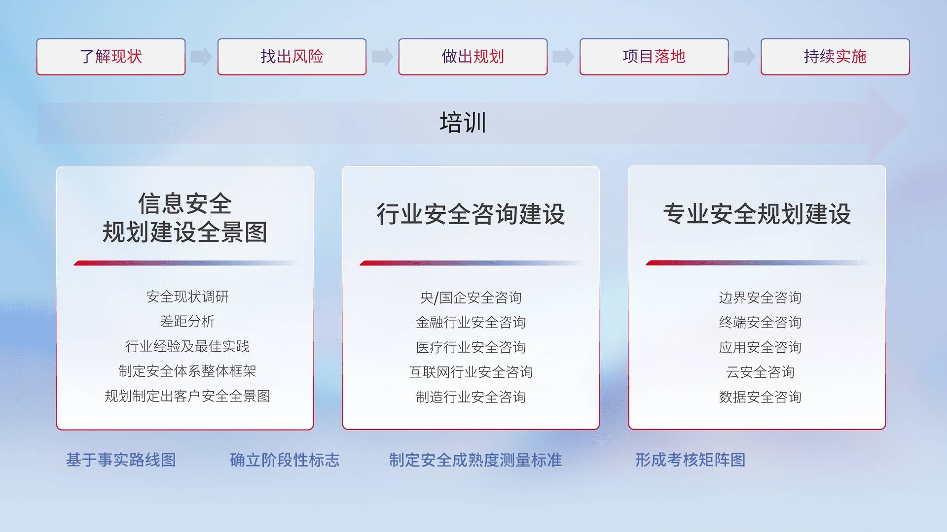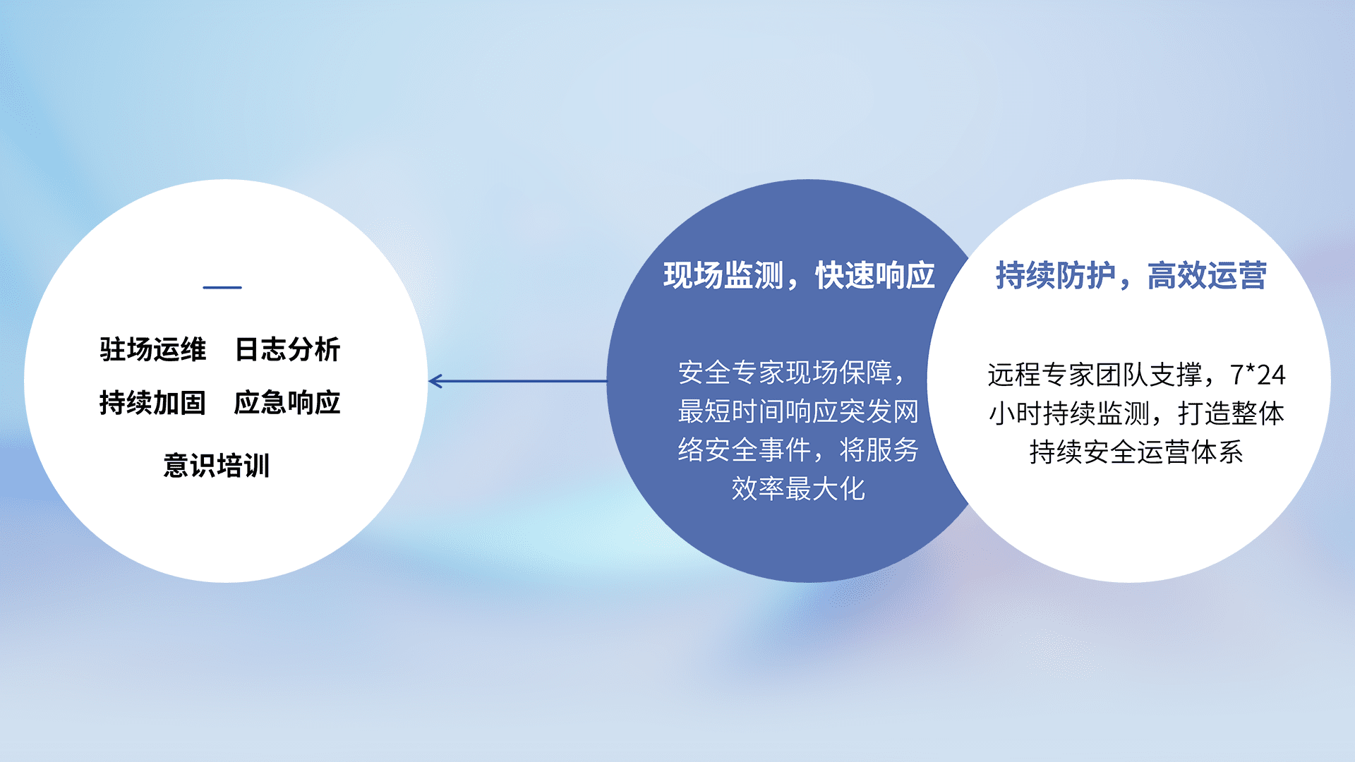针对客户行业特性,,以专业的安全服务+多厂商联合解决方案提供专属的一站式安全管理服务,,帮助客户全面感知网络空间威胁,,,基于识别、、、检测、、、分析、、防护、、监测、、、、响应的服务理论模型,,,,从方案咨询、、集成交付、、、评估验证、、优化加固、、、运维运营,,致力于为客户提供完整的闭环管理式安全服务。。。以实战经验为客户打造高抵御风险的安全体系,,,,帮助客户发现威胁、、、对抗威胁、、处置威胁,,,不断积累安全对抗能力,,持续保障数字化安全。。